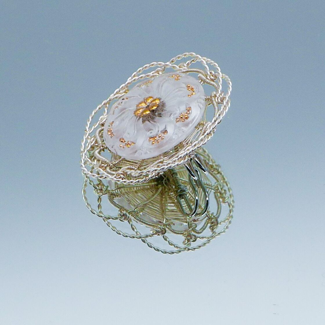 センターのガラスは、チェコ共和国リベレツ州 ヤブロネツの伝統工芸品で150年以上の長きにわたり、熟練の職人たちが伝統を守りオールハンドで作り続けている特別なボタンです。ブローチに加工しているのはワイヤーアート歴20年以上のキャリアを持つワイヤーアートティスト Nobu.